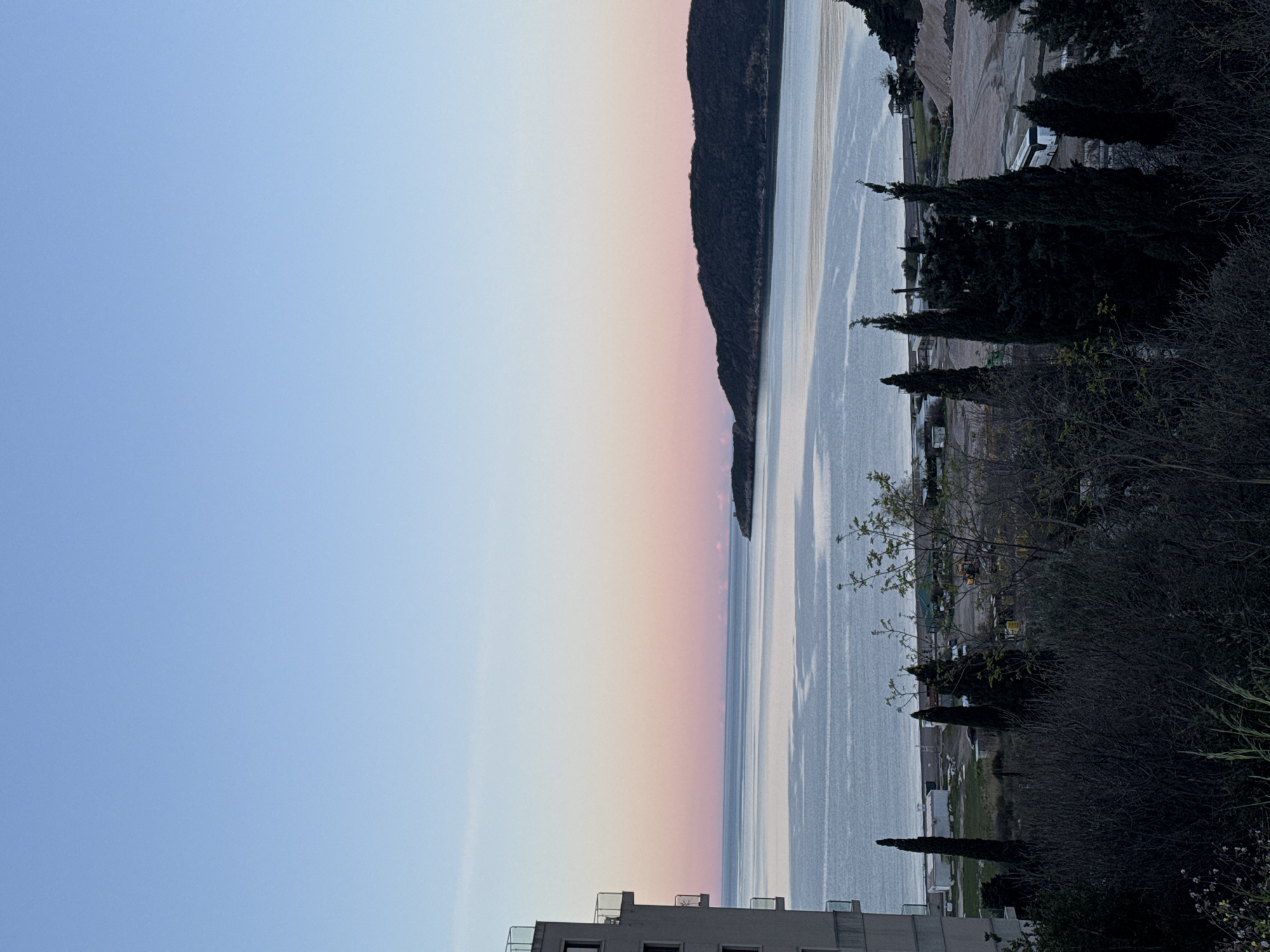 The image depicts a twilight scene in Boreti, Montenegro, showcasing a view of the sea and a mountainous landscape. The sky transitions from blue to shades of pink and orange near the horizon. A mountain partially obscures the horizon line. The sea exhibits a shimmering surface due to light reflection. The foreground contains trees and buildings, with some appearing silhouetted. A building with a flat roof is visible in the bottom part of the image. Further away from the coast is some construction vehicles and equipment, as well as temporary structures.