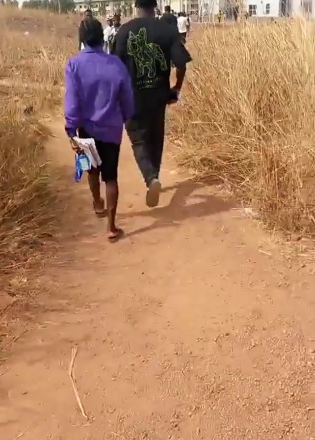 A video shows a group of people walking away from the camera on a dirt path. The environment consists of dry grass on either side of the path, and buildings are visible in the distance. The people are dressed in casual clothing; one person wears a purple shirt and black shorts, while another has on a black shirt with a graphic on the back. Other people can be seen further ahead on the path. The sky is overcast.
