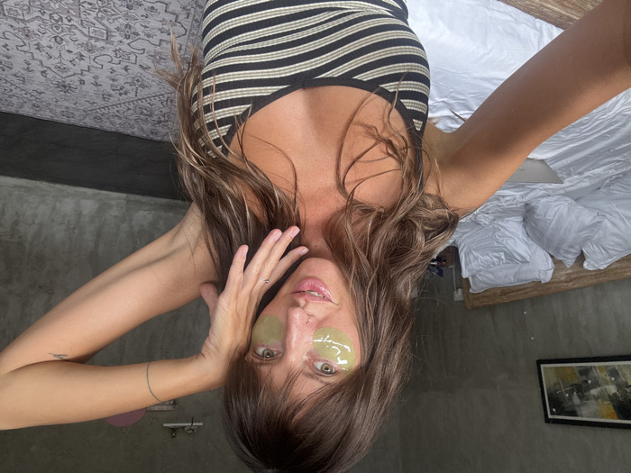 A woman lies on her back, wearing a striped top, with green eye masks. Her brown hair falls forward. She is indoors, in a room with a gray wall and a bed with white linens. A picture hangs on the wall. The camera angle is unusual, possibly a selfie taken at arm's length. The woman's hand is near her face.