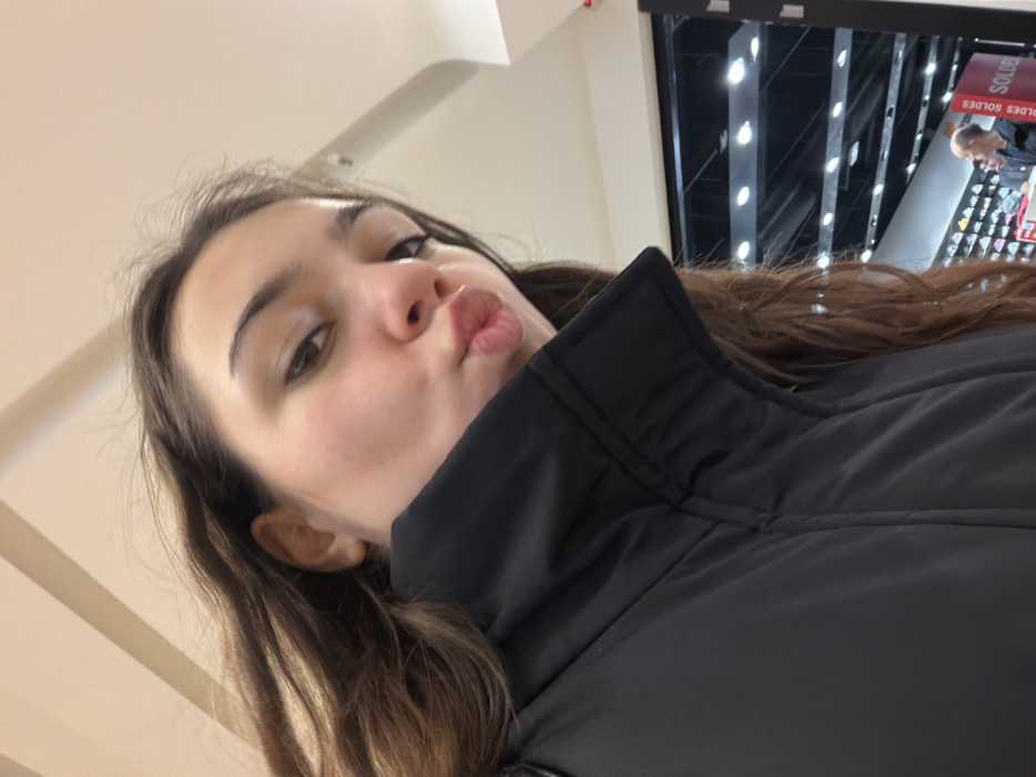 A young woman with long brown hair puckers her lips towards the camera. She's wearing a dark jacket with a high collar. The background shows a brightly lit interior, possibly a store, with rows of lights and what appear to be shelves of shoes. A person is visible in the distance near a sign with French text. The overall perspective is from a low angle, looking up at the woman.