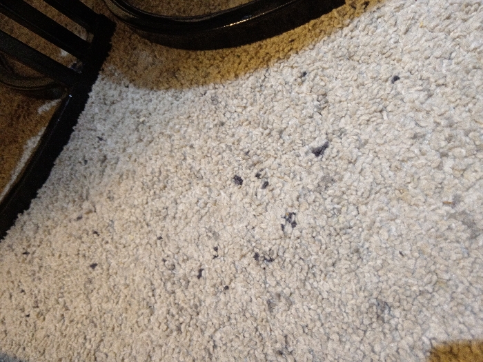 The scene is set in an unspecified indoor location within the city of Ijoko, Nigeria. The image provides an overhead view of a floor surface. The predominant feature is a light-colored, possibly off-white or beige, textured carpet with a visible pile. Scattered across the carpet's surface are numerous small, dark, irregularly shaped particulate matter. In the upper left quadrant, a partial view of a black, rigid, and possibly reflective object, consistent with a furniture leg or frame, is present. Adjacent to this object, a section of a darker, possibly brown or tan, floor covering or rug is visible. No individuals, actions, or further objects are discernible in the frame.