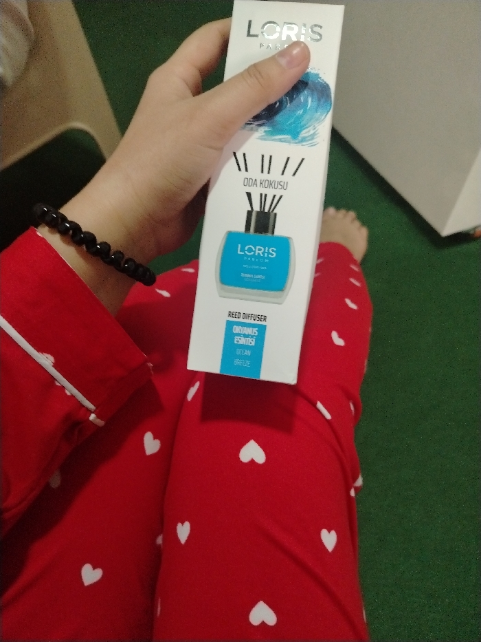 The image depicts a person's left arm, hand, and upper leg, situated indoors, reportedly in Navoiy City, Uzbekistan. The subject wears red pajamas adorned with multiple white heart patterns, and a black beaded bracelet is visible on their left wrist. A bare foot is partially visible on the lower right side of the frame. The left hand holds vertically a white rectangular product box, labeled "LORIS PARFUM" at the top. The box features a blue wave graphic, an illustration of a light blue reed diffuser bottle also branded "LORIS PARFUM," and text including "ODA KOKUSU" (room scent), "REED DIFFUSER," and "OKYANUS ESİNTİSİ" (Ocean Breeze). The immediate background consists of a dark green carpet or rug, with an indistinct light-colored object, possibly furniture, visible in the upper left.