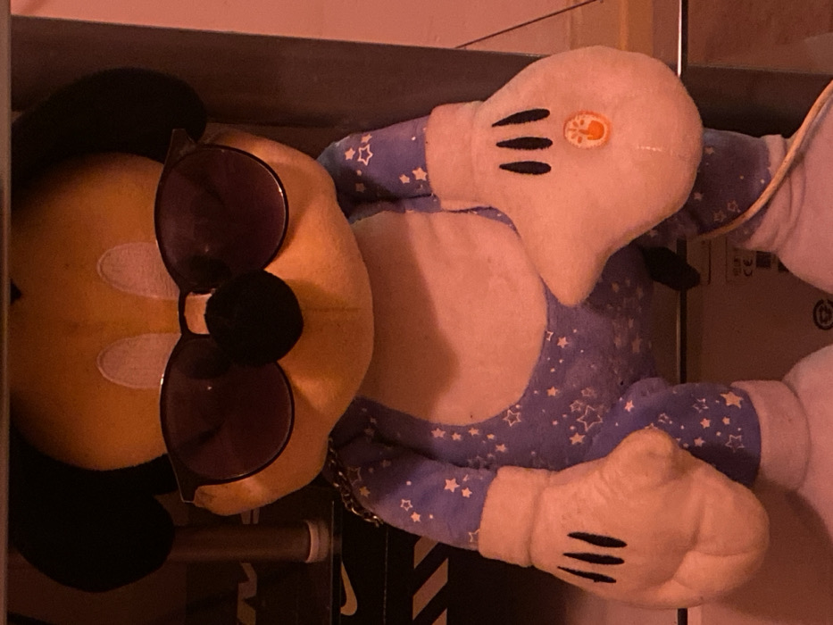 A plush Mickey Mouse doll, lying on its side, dominates the image