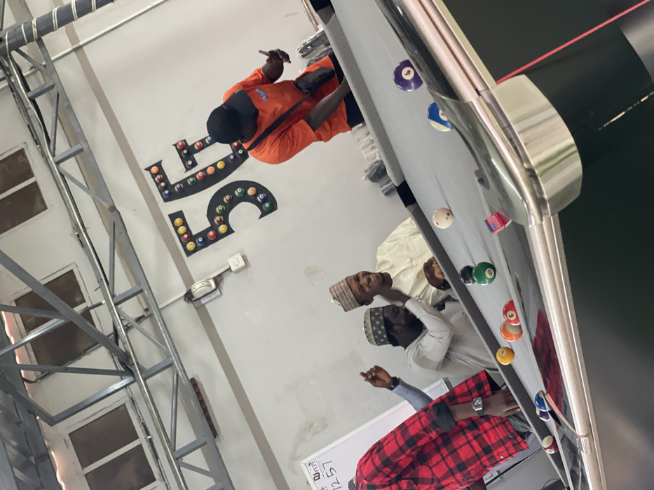 This image captures an indoor scene in Jama A, Nigeria, featuring four adult males gathered around a pool table. The room has white walls, with exposed metal ceiling trusses and windows visible at the top. A large "5G" graphic, illuminated and decorated with various pool balls, is mounted on the far wall. To the left, a partial view of a whiteboard shows the text "DJ" and "257". The central focus is a light grey felt pool table with black and silver/chrome trim, on which multiple pool balls are scattered, including red, yellow, orange, green (marked '6'), purple (marked '4'), blue (marked '2'), and a white cue ball. From left to right: 1. A male, partially visible, wearing a red and black plaid long-sleeved shirt and a watch on his left wrist. His arm is extended towards the table. 2. A male with a beard, wearing a light-colored traditional cap and matching garment, is seen smiling broadly and looking towards the table. His right arm is raised. 3. Another male, also wearing a light-colored traditional cap and garment, stands beside him, smiling and looking at the table. 4. A male in a black baseball cap, an orange t-shirt, and a black sling bag across his chest is leaning over the pool table. He holds a black smartphone in his right hand, pointing it towards the table. The atmosphere appears social and engaging, with individuals observing or participating in an activity around the pool table.