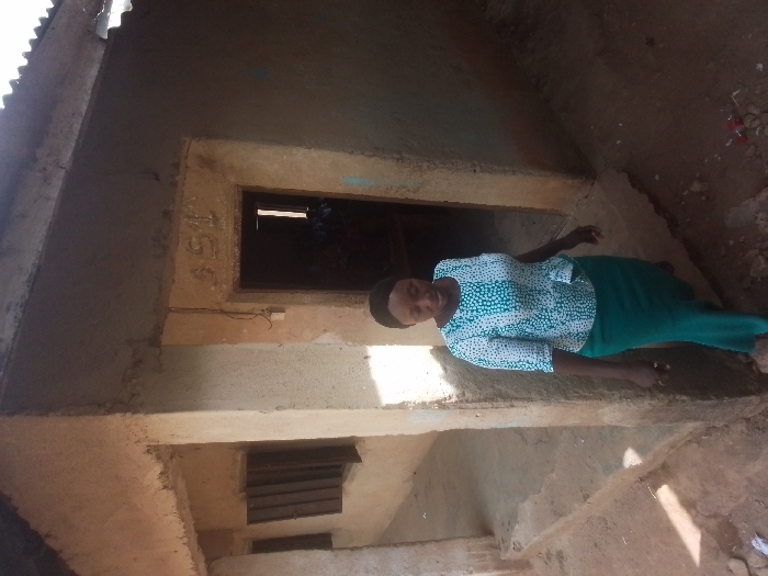 A woman stands outside a concrete building. She wears a light blue and white patterned top and a long, green skirt. The building has a partially exposed concrete structure with a doorway above her and a set of windows below. The surrounding ground appears rough and uneven.