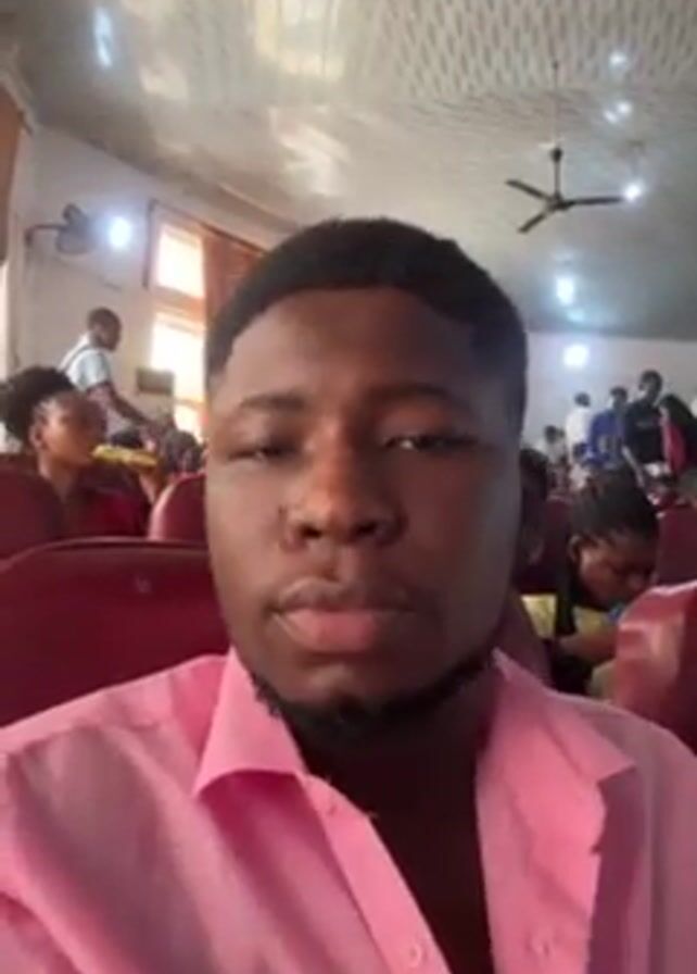 A young man wearing a light pink button-up shirt is recording a video of himself while sitting in a maroon-colored seat in a large room