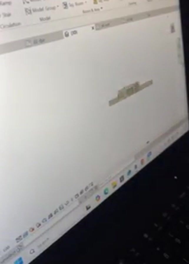 close-up of a laptop screen displaying Autodesk Revit software. The screen switches between a 3D rendering of a simple building structure and a 2D floor plan view. The software interface is visible with various tabs and tools. The laptop is black, with a partially visible keyboard. In the background, indistinct chatter and children’s voices can be heard. The environment appears to be indoors.