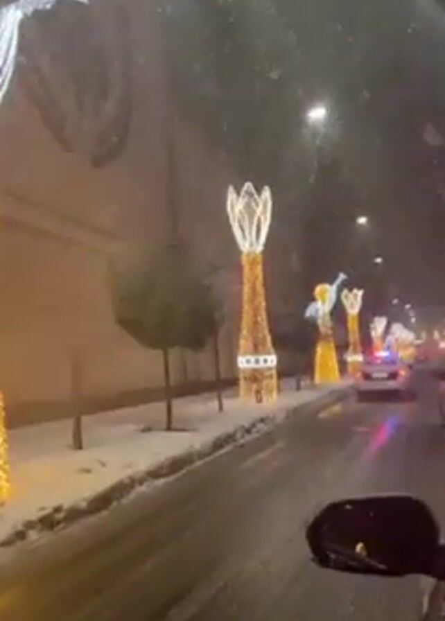 A car is moving down a snowy city street at night, illuminated by streetlights and golden holiday decorations. The decorations include figures of angels playing trumpets and tall, column-like structures resembling flowers. Snow is falling heavily, obscuring the visibility of the road and surrounding buildings. The road surface is wet, and snow is accumulating along the sidewalks. Other vehicles are visible on the road, including a silver car ahead. The camera is positioned inside the moving car, capturing the scene through the side window.