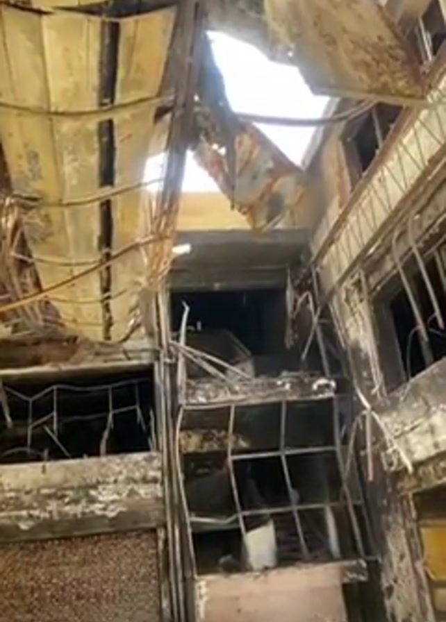 The video depicts a devastated multi-story building, showcasing the extensive damage caused by a fire
