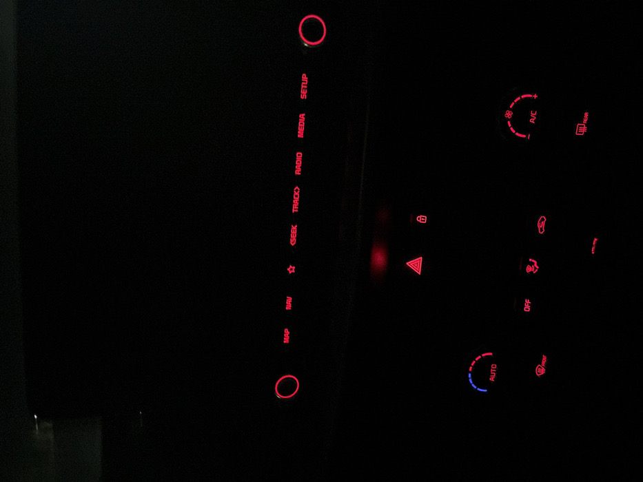 The image displays the illuminated dashboard controls and unlit infotainment screen of a vehicle, located in Mirandela, Portugal. The scene is dark, suggesting nighttime or an unlit interior. In the upper section, a rectangular, unlit infotainment screen is visible. Below it, a horizontal row of red backlit buttons includes a circular control on the left, "MAP," "NAV," a star icon, "<SEEK TRACK>," "RADIO," "MEDIA," "SETUP," and a circular control on the right. The middle section features a red illuminated triangular button, consistent with a hazard lights control, to the left of a red illuminated symbol resembling a locked door. The lower section presents the climate control panel. On the left, a circular dial for temperature control displays "AUTO" and indicators with blue (cool) and red (warm) segments. Below it is a red illuminated button marked "FRONT" for defrost/defog. In the center, red illuminated buttons include "OFF," an air recirculation symbol, and a fan direction symbol. On the right, a circular dial for fan speed shows red illumination around its circumference and has an "A/C" button in its center. Below this dial, a red illuminated button is marked "REAR" for defrost/defog. No individuals are present in the image, and no specific actions or interactions are depicted beyond the illuminated controls.