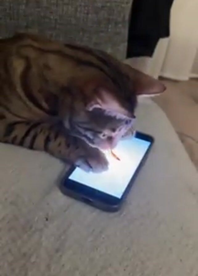 - "A Bengal cat is lying on a gray blanket and interacting with a smartphone" by FM-KTJV22, licensed under CC BY 4.0