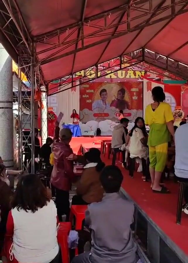 stage setup under a red steel-framed awning, with a red carpet leading up to it. Several people are standing and sitting around the stage, looking toward the performance. A woman in red is speaking at a small table draped in blue, while another woman in a pink dress stands at a microphone and sings. A backdrop behind them features images of the performers and the text "TAN XUAN MOI XUAN." The scene appears to be an outdoor event or celebration.