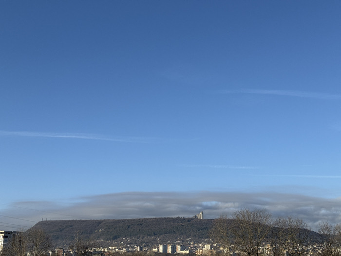 The image displays a panoramic view of the city of Shumen, Bulgaria, looking towards the Shumen Plateau. The upper two-thirds of the frame consists of a clear, bright blue sky with a faint, horizontal contrail visible across the middle. A low band of light grey, wispy clouds partially obscures the upper portion of a large, tree-covered mountain that dominates the mid-ground. Situated on the upper right side of this mountain, the distinct, light-colored, Brutalist-style Monument to 1300 Years of Bulgaria is clearly visible. Below the mountain, the urban landscape of Shumen is depicted, featuring numerous multi-story buildings with light facades. In the immediate foreground, several deciduous trees with bare branches partially obscure the city and the base of the mountain. A utility pole and cables are partially visible on the far left. No individuals or specific actions are discernible. The scene is static, illuminated by daylight, suggesting a clear winter or early spring day.