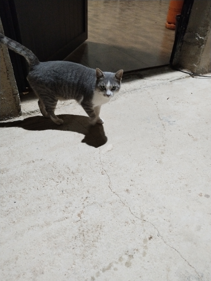 A gray and white cat stands on a light gray concrete floor, casting a shadow. The cat faces the viewer with a direct gaze. It is positioned near an open doorway, with the interior visible behind it. A portion of a wall or structure is visible on the right side of the frame. The concrete floor shows signs of wear with a crack running across its surface.