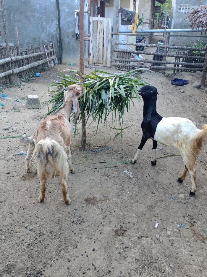 The scene depicts an unpaved outdoor area in the city of Unknown, Unknown. Three goats are positioned around a central makeshift feeder comprising a vertical wooden pole wrapped with a substantial bundle of long, green leafy fodder. A light brown goat, facing away from the camera, consumes grass from the feeder; its hindquarters show light-colored fur with dark soiled markings. To its left, a second, similarly colored goat is partially visible, also eating from the bundle. A third goat, predominantly black and white, stands to the right of the feeder, looking towards the camera while consuming grass; it features a black head and neck, a white body, and light tan hindquarters. The ground is dry, light brown compacted dirt, scattered with small stones, goat droppings, and miscellaneous debris, including fragments of plastic and a blue plastic basin in the mid-ground. In the background to the left, a rustic fence constructed from horizontal wooden poles borders a grey concrete wall. To the right, another section of similar wooden fencing partially obscures a residential structure with an open wooden door, laundry hanging from a line, and a partially visible motorcycle parked behind the fence.