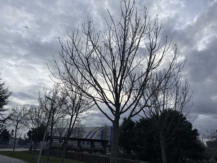 The scene depicts an outdoor environment under an overcast sky in Zeytinburnu, Turkey. The foreground features a paved pathway on the left, adjacent to a strip of green grass. Beyond the grass, a line of bare, deciduous trees, characterized by their intricate, leafless branches, stands silhouetted against the bright, cloudy sky. The largest of these trees is positioned centrally. In the midground, a low, dark fence runs horizontally, separating the immediate foreground from a complex of structures. Prominently visible is a large, modern building with a distinctive curved, light-colored roof featuring multiple dark blue horizontal stripes, indicative of a sports facility such as an ice rink or arena. Below this, a smaller, rectangular building with dark windows and a lighter roof is partially obscured. Dense evergreen trees and shrubs form a dark green backdrop to the right of these structures and in the distance. The sky is filled with numerous gray, textured clouds, with a brighter area of diffused light visible through the clouds in the upper-middle right, suggesting the position of the obscured sun. A single dark bird is captured in flight in the upper-left quadrant of the sky. No individuals, explicit actions, or interactions are present within the frame. The environmental conditions suggest a cool season (late autumn, winter, or early spring). The large building strongly indicates the location is in the vicinity of a major sports complex in Zeytinburnu, potentially the Zeytinburnu Ice Hockey and Ice Skating Hall area.
