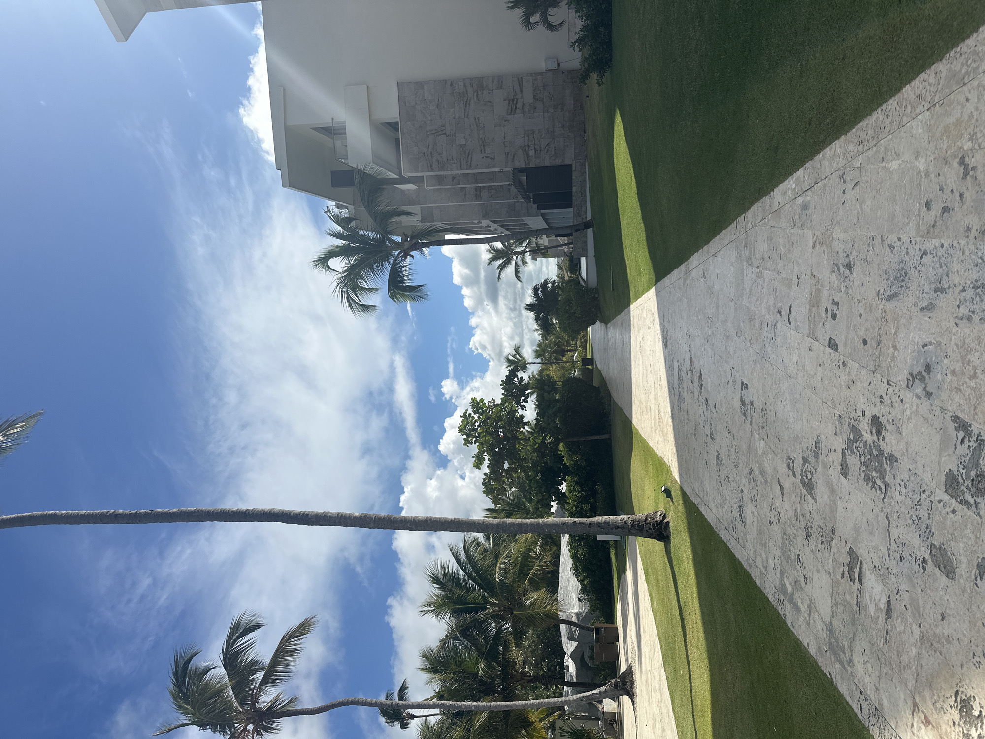 This image depicts a tropical outdoor scene within a resort-like setting in Higüey, Dominican Republic, under a bright, partly cloudy sky. A straight, light-beige paving stone pathway, approximately 3 meters wide, extends from the foreground into the distant background, displaying irregular dark gray discoloration across its surface. Lush, short-cut green grass meticulously borders both sides of the pathway. On the right, a multi-story building with a flat white facade and alternating sections of dark grey stone cladding rises vertically. This structure features recessed balconies with light-colored railings and dark, rectangular window openings. Multiple palm trees, including one exceptionally tall and slender specimen prominent in the central-left foreground, are distributed throughout the scene. Dense green tropical foliage forms a backdrop on the left side of the frame. The sky exhibits patches of deep blue intersected by wispy cirrus and puffy cumulus clouds. Strong direct sunlight illuminates the scene from the upper right, casting sharp, elongated shadows onto the grass and portions of the pathway. No human figures or discernible actions are present within the frame. A small, dark cylindrical ground lamp is visible embedded in the grass to the left of the pathway.