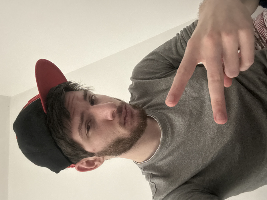 A young adult male is depicted in a close-up, chest-up indoor portrait, located within the city of Cachan, France. The individual wears a grey long-sleeved t-shirt with a white collar trim and a black and red baseball cap worn backward on his head. He has dark brown hair, a dark brown beard, and a mustache. His left hand is raised in front of his chest, forming a V-sign with the index and middle fingers extended. He looks directly at the camera with a neutral expression. The background consists of a plain, light-colored wall, with a subtle angled surface visible in the upper right portion of the frame.