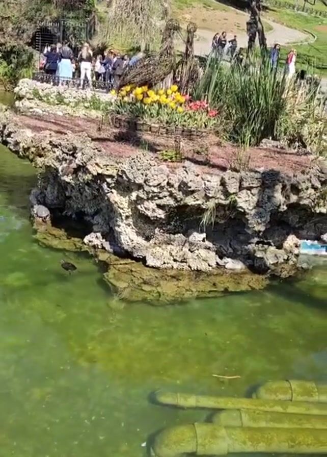 The scene captures a pond in a park on a sunny day. The pond's water is greenish, with several cylindrical objects lying submerged at the bottom. On the edge of the pond, there's a rock structure decorated with flowers and crafted bird figures. People are seen walking and sitting in the background, with trees and a grassy slope completing the park setting.