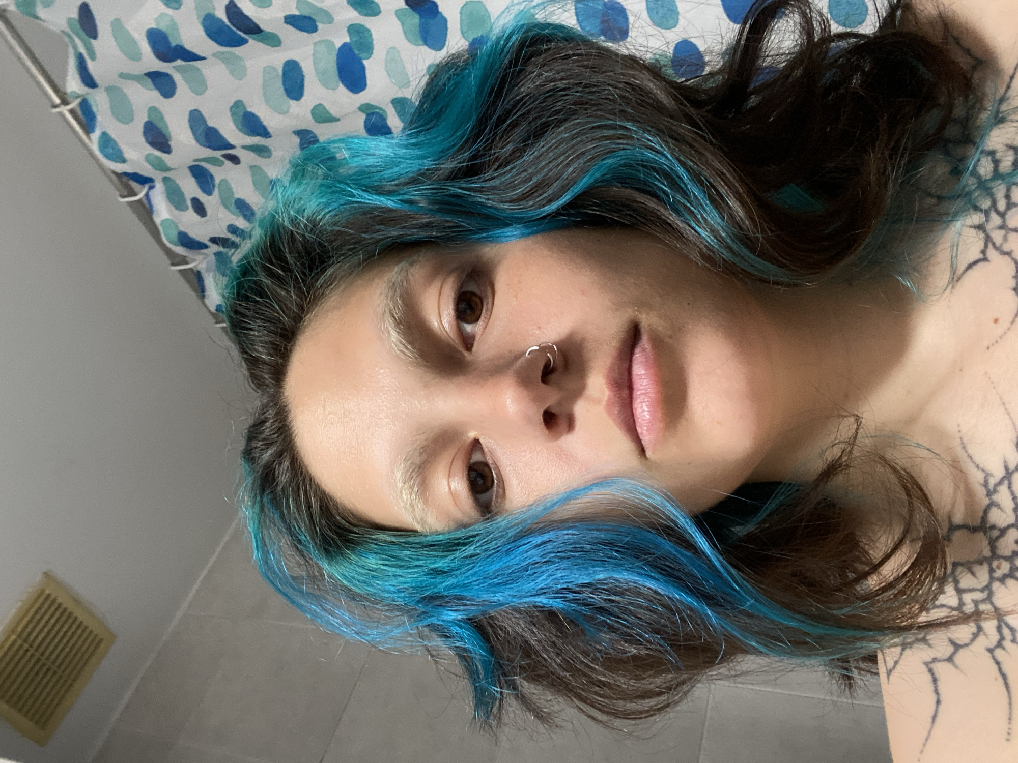 The image depicts a close-up, low-angle selfie of an individual in a private residential bathroom located in Gijón/Xixón, Spain. The subject is an individual with medium skin tone, dark brown wavy hair featuring prominent turquoise blue streaks, and bleached light blonde eyebrows. They possess brown eyes, a nose piercing consisting of two silver hoops in the left nostril, and visible tattooing on the upper left chest/shoulder area, displaying a dark, abstract, crack-like or web-like pattern. The individual appears to be looking directly at the camera. The background elements identify the location as a bathroom. To the left, a light-colored tiled wall with a visible grout line is present. Above this, a white ceiling features a rectangular, beige-colored exhaust vent with horizontal slats. To the right, a white shower curtain with a pattern of irregular blue and teal oval shapes is visible, suspended by white rings from a metallic shower curtain rod.