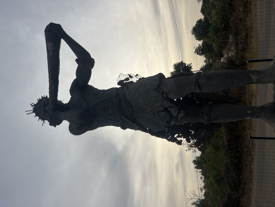 A dark, silhouetted statue of a figure stands against a bright, cloudy sky. The figure is holding a rectangular object above its head with both hands. The statue is weathered and shows signs of decay, with fragmented sections and attached netting. The background reveals greenery and hints of a road or path along with a fence.