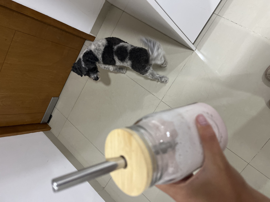 The image depicts an indoor scene in Barrio de Nuevo León, Mexico. In the foreground, a light-skinned human hand holds a clear glass mason jar containing a frothy, light pink liquid. The jar is topped with a light-colored wooden lid featuring a central opening, through which a silver-colored metal straw protrudes vertically. In the midground, a medium-sized dog with a patchy black and white coat stands on a light-colored tiled floor. The dog is positioned with its left side and back partially facing the viewer, looking towards a solid brown wooden door. Its tail is blurred, suggesting motion. The background consists of a plain white wall on the left, and the brown wooden door with a silver horizontal plate at its base on the right. A portion of a white vertical surface, possibly a cabinet or wall, is visible on the far right edge of the frame.
