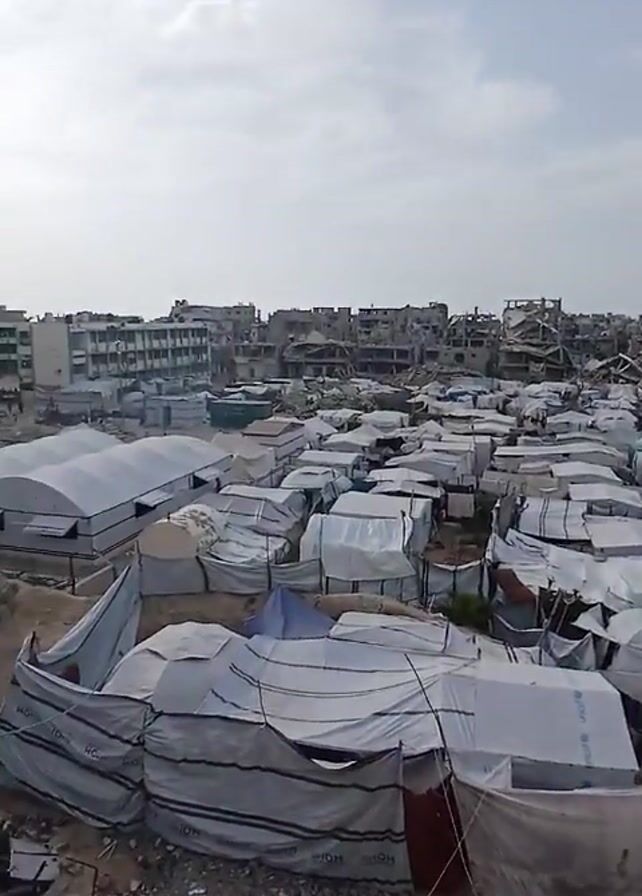 large refugee camp in a devastated urban area. There are many tents erected closely together, all seemingly made of the same white material. The background reveals partially destroyed buildings, likely due to conflict or natural disaster. People are visible walking in the dirt road between buildings and tents, and a white car is parked on the road. The video appears to be taken from a higher vantage point, like the roof of one of the buildings. There is a green garden hose visible in the foreground.