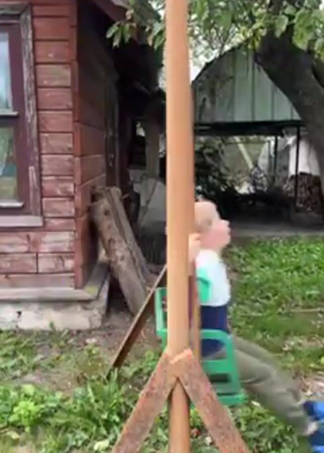 The scene is set outdoors, in a yard with a rusty, metal structure taking center stage. This structure appears to be some sort of support or frame. Behind it is a small, rustic wooden building with peeling red paint and a visible window. To the right, a glimpse of another building or shed can be seen. The ground is covered in grass and foliage, suggesting a natural, possibly rural environment. The lighting suggests it is daytime. The only other activity is someone is heard saying "oh".