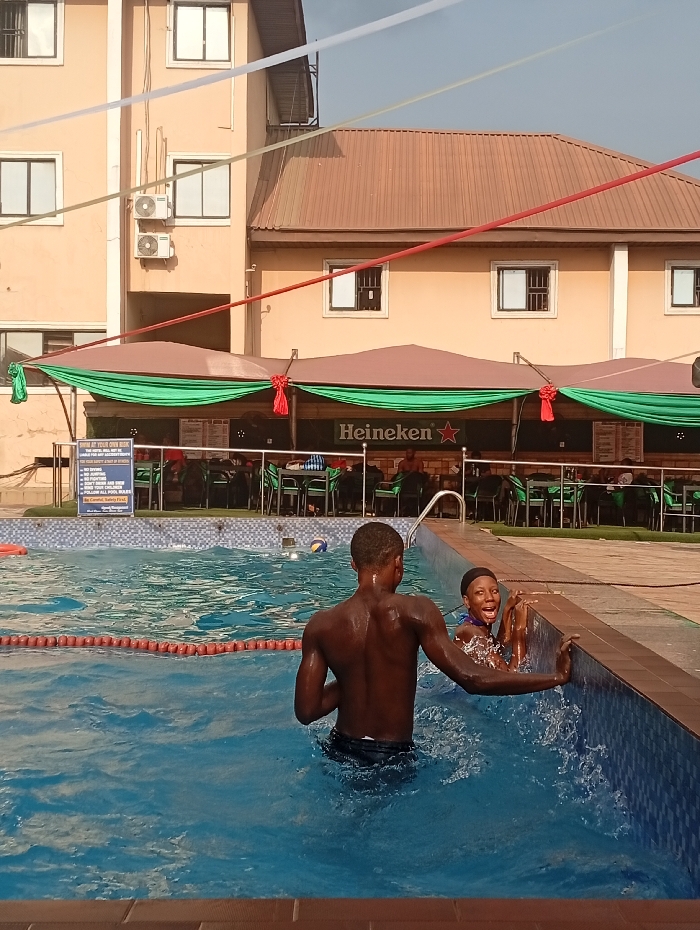 The image portrays an outdoor swimming pool environment at a facility in Onitsha, Nigeria, under clear daylight