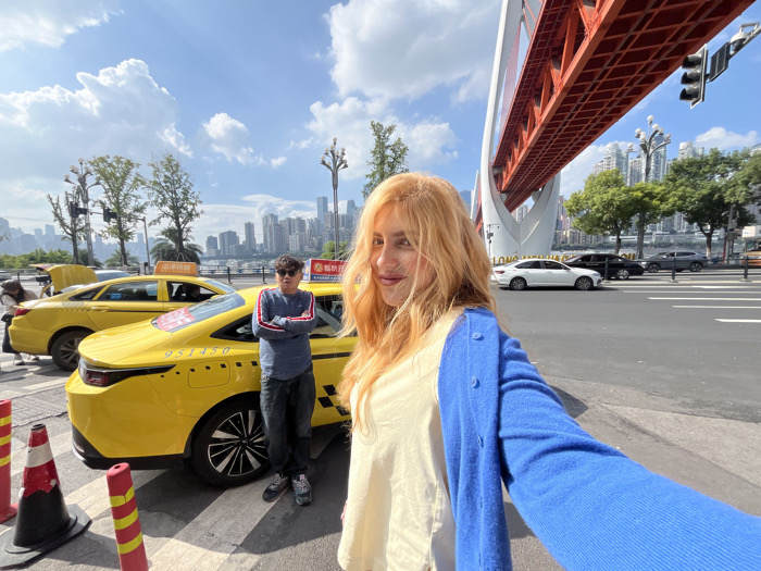The image depicts an urban street scene in Nan'an District, Chongqing, China, under a clear blue sky with scattered white clouds. In the foreground, a woman with long, light reddish-blonde hair, wearing a light-colored top and a bright blue cardigan, is taking a selfie, her right arm extended towards the camera. Behind her, positioned to the left of the frame, a man with dark hair and sunglasses stands beside a yellow taxi, his arms crossed over his chest. He wears a grey long-sleeved shirt with red and white striped sleeves, dark jeans, and sneakers. The yellow taxi has "951450" visible on its trunk and a black and white checkerboard pattern on its side. Another yellow taxi with an open trunk is visible further back on the left. Overhead, a prominent red-painted truss bridge, identifiable as the Longmenhao Bridge by a partial "LONG MEN HA" inscription on a white support column, spans the scene. A multi-lane asphalt road with white crosswalk markings is visible, carrying various vehicles including a white sedan, a black sedan, and a grey SUV. In the background, a dense city skyline composed of numerous high-rise buildings and green foliage lines the horizon. Red and black traffic cones are positioned on the paved area in the lower left. Traffic lights are suspended from a pole near the bridge structure.