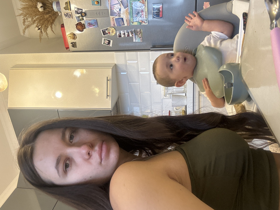 The image depicts an indoor scene within a kitchen in Akulovo (Gp Kubinka), Russia. In the foreground, an adult female is positioned on the left, capturing a selfie or being photographed. She has long, dark brown hair and a neutral facial expression, looking directly at the viewer. She wears a dark olive green strapless top. To her right, an infant or toddler is seated in a grey high chair. The child wears a white t-shirt and a light green silicone bib, with short, light brown hair. The child's mouth is slightly open, and both hands are raised, palms outward, conveying a surprised or attentive expression. In front of the child, a light-colored surface holds a light green bowl with a silver spoon and a pink-handled spoon. The background reveals a kitchen environment. Directly behind the child, a white subway tile backsplash is visible, topped by light-colored kitchen cabinets with horizontal silver handles. A grey cabinet unit is partially visible on the far left. To the right, a stainless steel refrigerator is heavily decorated with various magnets and photographs. On the countertop beneath the cabinets, a clear pitcher, a white mug, and a red-lidded container are present. Above the refrigerator, a vase containing dried botanical arrangements, including pampas grass and cotton bolls, is displayed. A circular ceiling light fixture is partially visible at the top center.