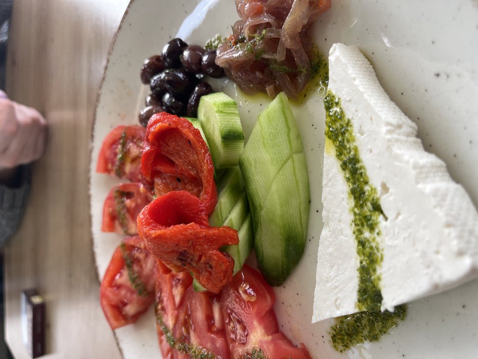 A close-up view depicts a meal arranged on a white, speckled plate, resting on a light brown wooden table in Sapareva Banya, Bulgaria. The plate features an assortment of fresh and prepared ingredients. On the left, multiple slices of red tomato are visible, some garnished with a green herb oil or dressing. Adjacent to these are several pieces of roasted red bell pepper, characterized by their deep red color and slightly wrinkled texture. Below the peppers, green cucumber slices are arranged, some overlapping and appearing decoratively cut. A cluster of dark, whole black olives occupies the upper right portion of the plate. Below the olives, a small serving of reddish-brown sliced onions, possibly caramelized or marinated, is visible, mixed with green herbs and drizzled with oil. A prominent, triangular wedge of white cheese, likely feta, is positioned at the bottom, marked with a distinct stripe of the green herb oil across its top surface. In the blurred background, a person's hands are visible on the wooden table, wearing a grey long-sleeved garment, alongside a small, dark brown rectangular object.