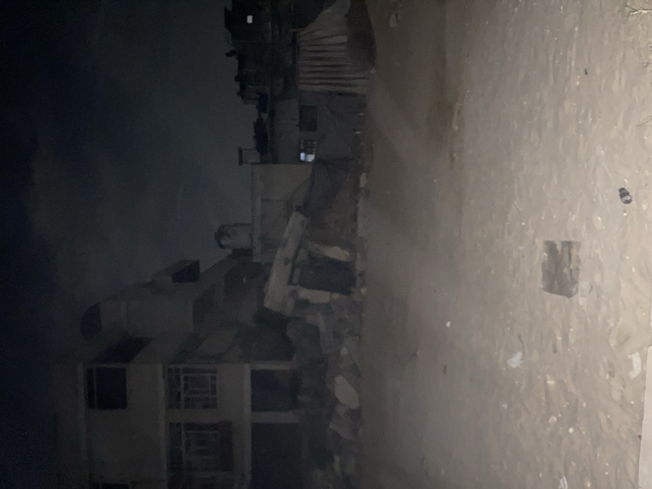 The image depicts a nighttime scene in Khan Yunis, Palestinian Territory. The foreground features uneven, light-colored sandy ground with scattered debris, including a dark, square block centrally placed and a small dark object to its right. In the midground, a multi-story building stands partially intact on the left, displaying multiple windows, while its lower section is obscured by a large pile of concrete rubble and structural debris, indicating significant damage or collapse. Adjacent to this wreckage, a smaller, single-story building is visible, with a faint light emanating from one of its windows. To the right of this structure, a barrier constructed from corrugated metal sheets extends. The background shows a dark, featureless night sky, with the faint silhouettes of distant structures and a single point of light visible on the horizon to the right. No individuals or discernible activities are present in the frame.