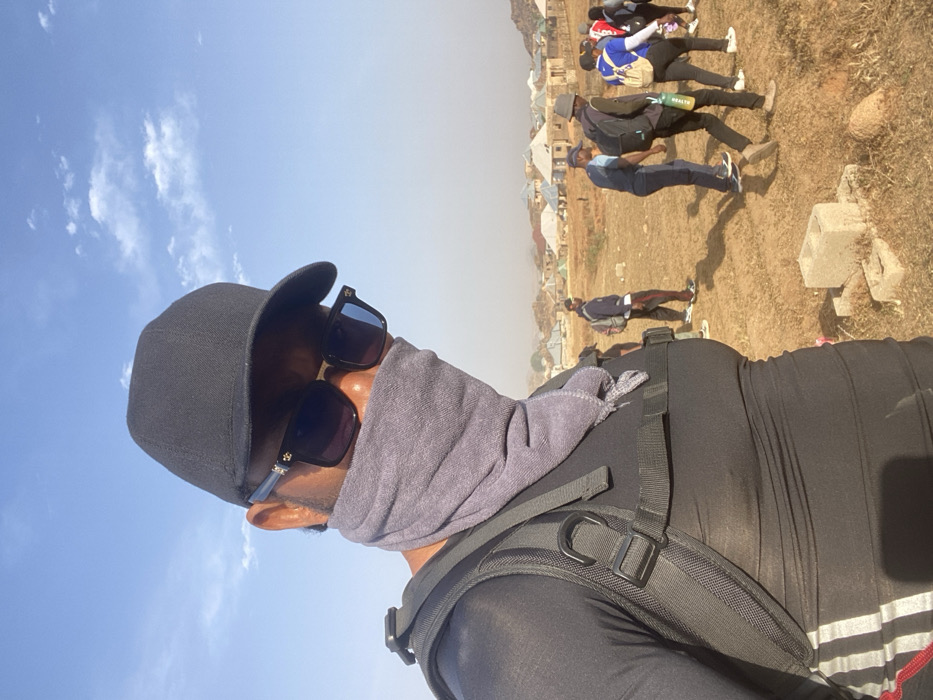A person in a black cap and sunglasses stands with a gray neck gaiter, possibly for sun protection. The person wears a black backpack and black clothing. In the background, a group of people walks in a field, with houses and buildings visible in the distance under a clear sky. The landscape seems somewhat dry and dusty. The image is rotated slightly.