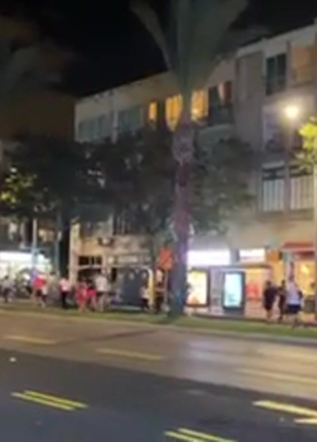 street scene at night. People are walking on the sidewalk and crossing the street. Some people are running on the street. There are buildings on both sides of the street, with lit-up storefronts. Palm trees line the street. There are streetlights and a large LED screen with blue lights. Traffic signals are visible. An ambulance is seen driving on the street.