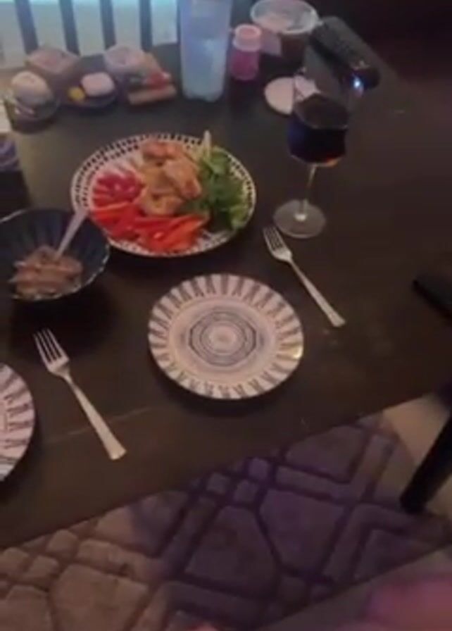 table set for a meal. There are three plates, two of which are filled with food. One plate contains what appears to be fried chicken, red peppers, tomatoes, and lettuce. Another plate holds a dark, saucy dish. There is a wine glass filled with a dark liquid on the table. There are several other items on the table including a water bottle, a pill bottle, and what appears to be a container of yogurt. A fork is placed next to each plate. The table is dark and sits on a gray rug. A person's legs are visible at the bottom of the frame. The video pans slightly.