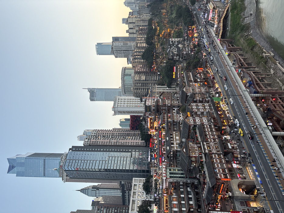The image depicts an elevated view of the bustling Hongyadong commercial complex and the surrounding cityscape in Chongqing, China