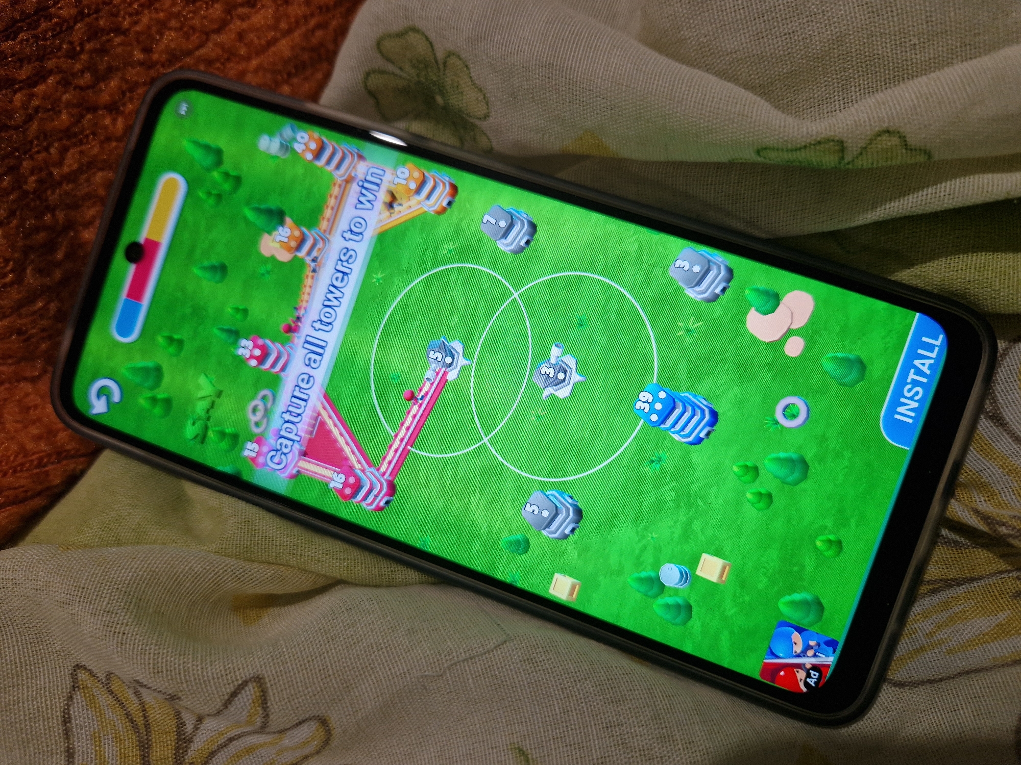 smartphone lying on a patterned fabric. The screen displays a game with a green background, featuring various tower-like structures, circular target zones, and numbered units. Text on the screen reads "Capture all towers to win." There are also buttons and icons visible, including a circular arrow, a colored bar, and an "INSTALL" button. A small advertisement is visible in the corner of the screen. The phone itself has a dark-colored frame. There is no evidence this image is taken in Raduvene, Bulgaria.