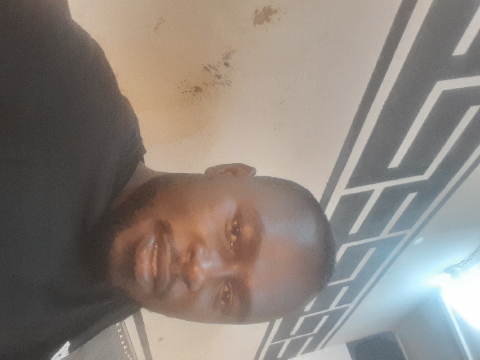 A dark-skinned man with a beard and close-cropped hair is wearing a black shirt. He is facing the camera with a slight tilt. His expression is neutral. The background includes a light-colored wall with what appears to be a decorative pattern of black and white geometric shapes, possibly a ceiling design. A light source is visible in the lower right corner, creating a glare. There are also smudges or spots on the wall in the upper portion of the image.
