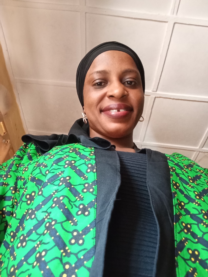 A woman is depicted in a low-angle, head-and-shoulders portrait, smiling and looking directly at the camera. She wears a black headwrap, a black ribbed top, and an open outer garment featuring a green, blue, and yellow patterned fabric with black lapels. Gold-colored hoop earrings are visible on both ears; the right earring has a twisted design. The background consists of a light-colored ceiling with a recessed grid pattern, indicating an indoor setting. A portion of a light-colored wall or structural element is visible on the upper left. The location is Narayi, Nigeria.