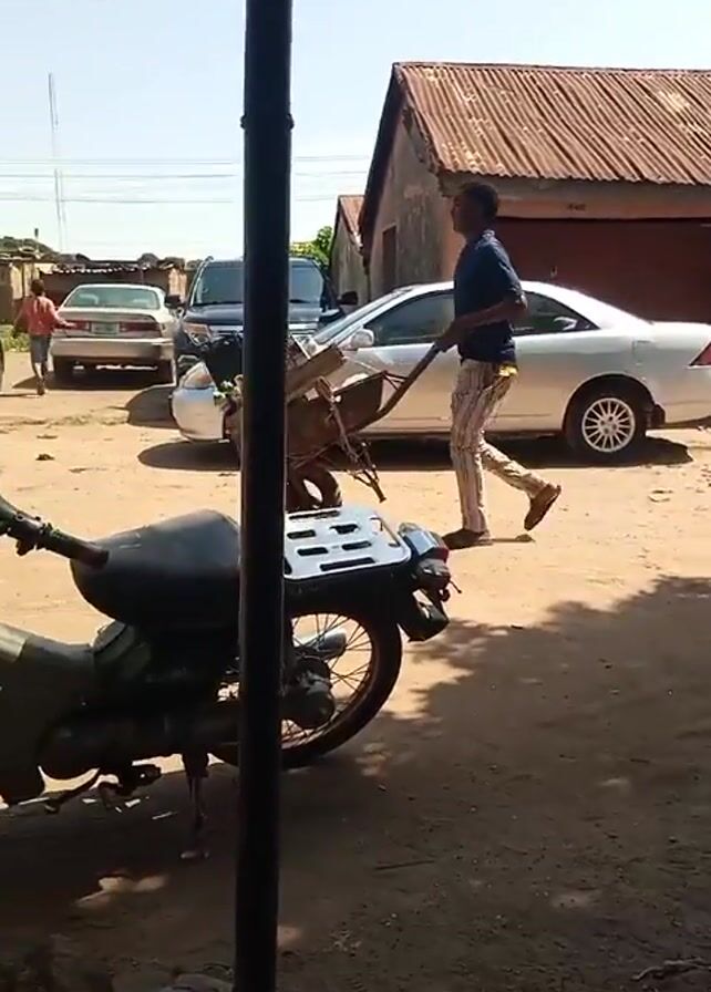 The video depicts an outdoor scene in what appears to be a residential or commercial area. A man is walking across the frame, pushing a wheelbarrow laden with various items. In the foreground, a vintage green motorcycle is parked. Several cars are parked behind the man. A building with a rusted metal roof is visible in the background. Another man, possibly working on the motorcycle, is seen in the foreground, cleaning his hands with a red cloth. The ground is unpaved and dusty. Clothes are hanging from a line at the top of the frame.