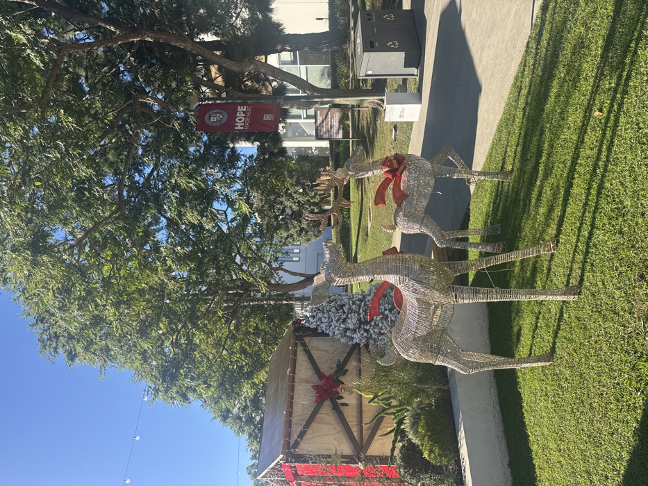 The image displays a Christmas outdoor scene. There are three wire reindeer figures adorned with red bows on the green grass. A decorated box with red ribbon and a white flocked tree sits nearby. Overhead, a tree casts dappled shadows. A "Hope Made Here" banner is visible. In the background, a building is partially visible behind the tree.