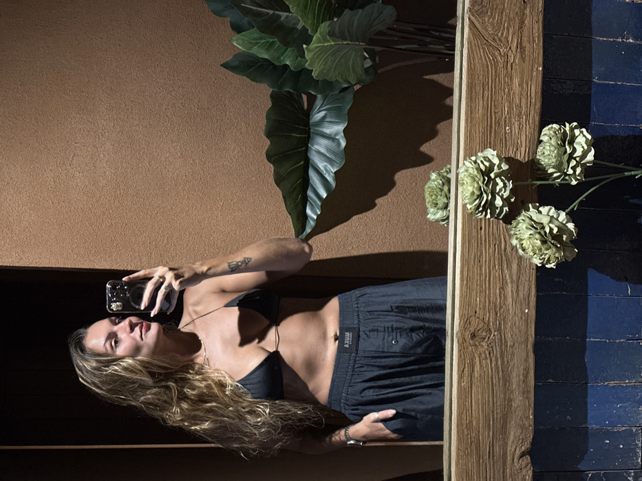 A female subject is captured in a mirror selfie taken indoors in Pecatu, Indonesia. She has long, wavy, light-brown hair and is wearing a black string bikini top and dark boxer-style shorts with an "AXUM" label visible on the elastic waistband. Her right arm is raised, holding a smartphone with a clear, possibly embellished case, to capture her reflection. A geometric tattoo is visible on her upper left arm, and she wears a ring on her left ring finger and a thin necklace. Her left hand is casually placed in her short's pocket. The background features a textured, matte brown wall. To the right, a large artificial plant with prominent dark green leaves casts distinct shadows on the wall. A rustic, horizontally positioned wooden beam serves as a frame or shelf below the mirror. Below this beam, a dark blue, possibly paneled, wall section is visible. Three sage-green artificial flowers on stems are positioned in front of the wooden beam, their reflections also visible in the mirror.