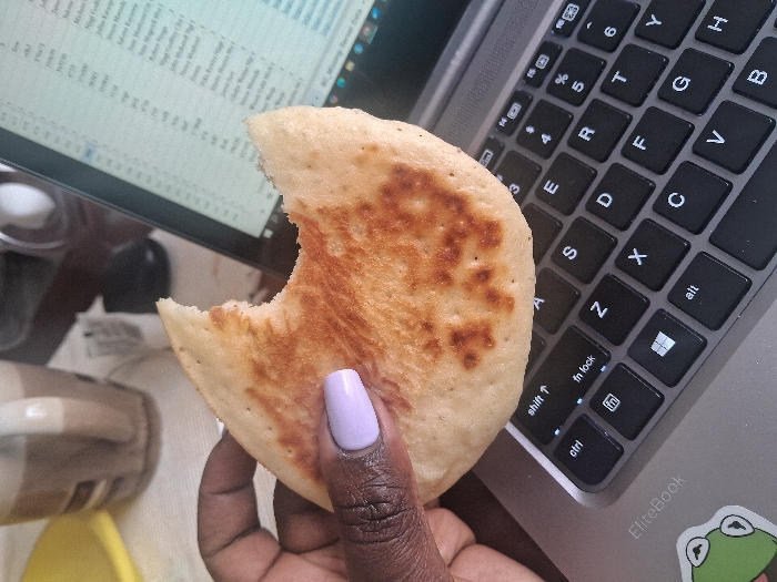 An overhead, close-up image depicts a dark-skinned hand with a light purple manicured fingernail holding a partially eaten, round, light-brown flatbread or pancake with a distinct bite removed