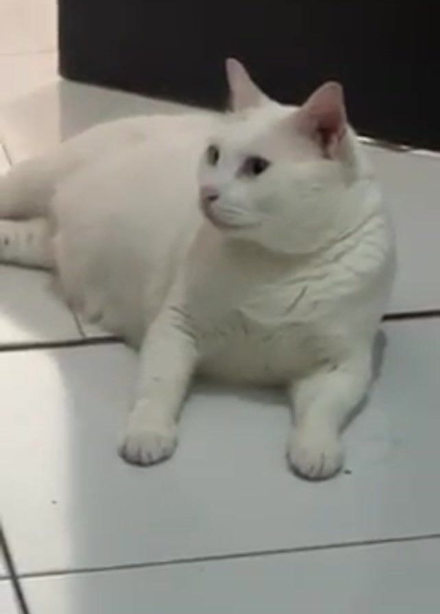 A white cat is lying on a white tiled floor. The cat is facing slightly to the left. Behind the cat is a black object, possibly furniture. The focus of the camera shifts slightly in and out.