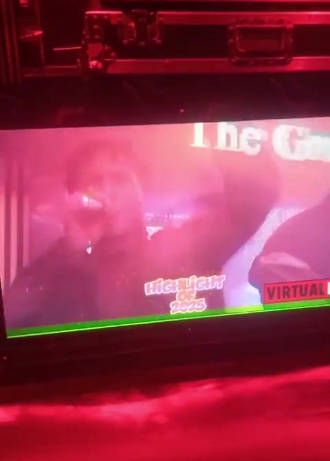 screen displaying a slideshow of images labeled "HIGHLIGHT OF 2023" with the "VIRTUAL DJ" logo. The screen appears to be part of a DJ setup, as it is surrounded by cases and equipment. The lighting in the room is predominantly red. The slideshow shows various people, including individuals in hats and sunglasses, and one image with the text "where the magic happens."