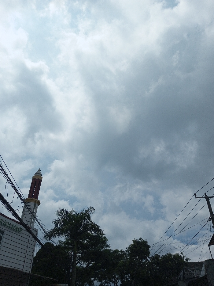 The image captures an outdoor scene in the city of Vieng Phouka, Laos, under a largely overcast sky with scattered patches of lighter blue visible through the clouds. A prominent white building occupies the lower-left, featuring a partial inscription "MAKMUR" on its facade and a tall minaret. The minaret's base is white with a gold-colored band, transitioning to a reddish-brown cylindrical shaft topped by a light-colored dome and finial. Numerous black utility lines crisscross the foreground, obscuring portions of the building and minaret. In the lower center and right, dense green foliage from various trees is visible, including a distinct palm-like tree. To the far right, a dark utility pole supports additional overhead power lines, with a section of a dark building roofline visible below it. No individuals are present in the scene, and no specific actions are depicted.