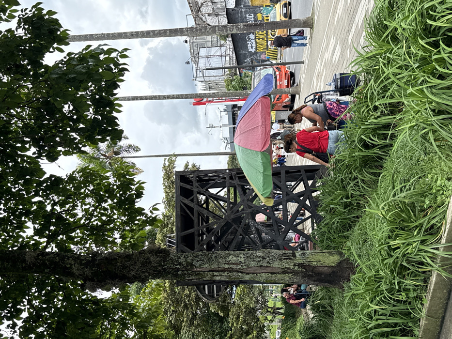 The scene depicts an urban street in Perimetro Urbano Pereira, Colombia, under an overcast sky. In the immediate foreground, a raised planter bed contains dense green foliage. To the left, a large tree with a textured, moss-covered trunk rises vertically, its canopy extending out of frame at the top. In the midground, a black, geometric, open-frame structure with a crisscrossing pattern stands behind the tree. To the left, two individuals are seated within a green area. To the right of the tree and structure, on a light-colored paved sidewalk, a multi-colored umbrella (red, green, blue segments) provides shade. Beneath it, two women are present; one, facing away from the camera, wears a red shirt and light pants, while the other, facing partially right, wears a grey tank top and patterned leggings, attending to a wheeled cart with a blue container. Other pedestrians are visible further along the sidewalk. In the background, a street runs parallel to the sidewalk. An orange public transit bus and a yellow taxi are visible on the street. A man in a dark shirt and white cap walks near the vehicles. Beyond the street, structures include a light-colored building with ornate architecture, partially obscured by scaffolding, and a building with dark, graffiti-covered walls featuring white text "PARQUEADE". Several tall palm trees and utility poles rise against the cloudy sky.