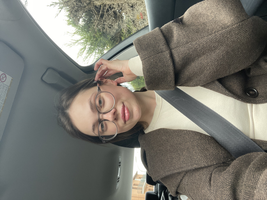 A young adult female is depicted seated within the interior of a vehicle, located in the city of Fiuggi, Italy. She is positioned in a front seat, secured by a dark-colored seatbelt extending diagonally across her chest. The subject has fair skin, dark hair, and wears clear-framed, round eyeglasses. Her lips are adorned with a light pink gloss, and she presents a subtle smile. She is dressed in a light-colored, ribbed top beneath a dark brown, possibly herringbone-patterned, winter coat featuring a wide lapel and a visible button. Her right hand is raised, with fingers touching the side of her head near her right temple and ear. The vehicle's interior components visible include a grey headliner, an overhead console, and a passenger-side sun visor with a partially legible warning label. Through the car windows, the external environment is observed: green foliage from trees or bushes on the right, and a multi-story building with a brown/tan facade, windows, and balconies on the left, indicative of urban residential architecture. The sky appears overcast.
