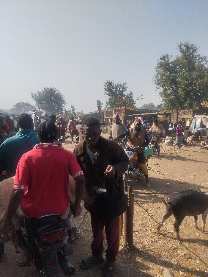 The image depicts an unpaved, dusty outdoor scene in Unguwan Rimi, Nigeria, under a clear, bright sky. The environment suggests a busy street or market. In the immediate foreground, a man in a red polo shirt with white trim is seated on a motorcycle, facing away from the viewer. To his right, a man in a dark brown jacket, maroon pants, and black sandals stands, holding a dark bag in his left hand and a small white item in his right. Adjacent to this standing man, a dark-colored pig is visible on a leash, tethered to a light brown vertical post in the ground. Numerous other individuals populate the midground and background, many appearing to be men. Several motorcycles are present; one is directly behind the standing man, and another is ridden by a man in a light brown vest further back. Market stalls, constructed from wood and corrugated metal, line the background, displaying various goods. Scattered trees with green foliage are visible, indicating an open area. The scene conveys active commerce and movement among people and motorcycles during daylight hours.